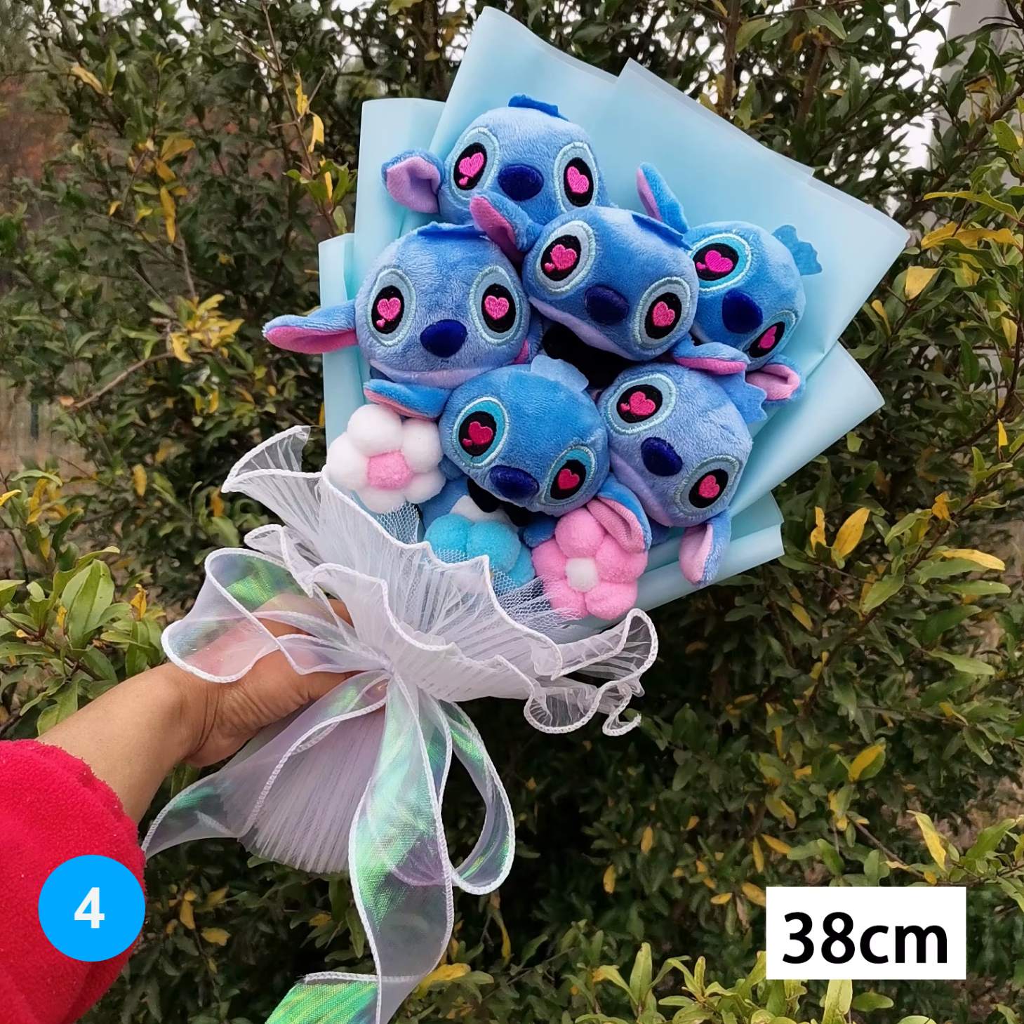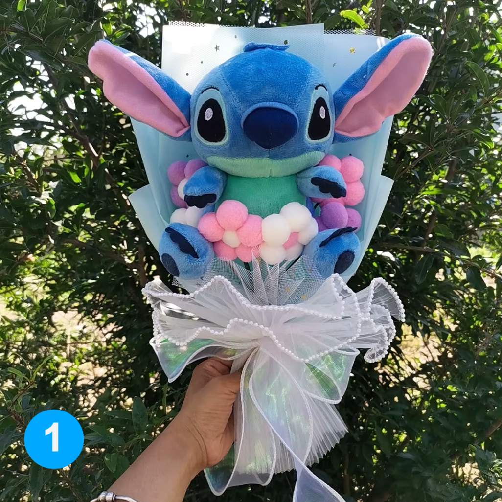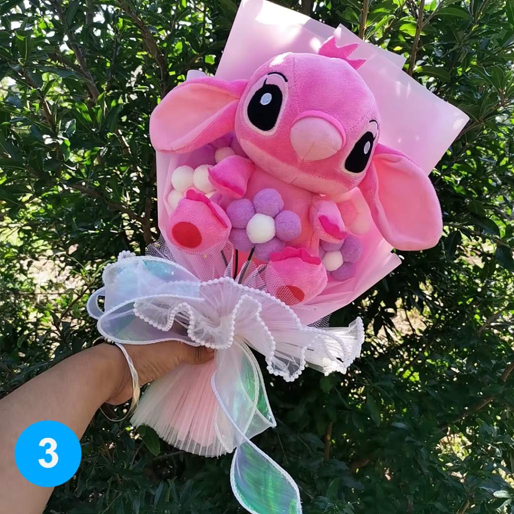 Os buquês possuem telas de seda super macias, e as pelúcias tem enchimento em algodão pp.